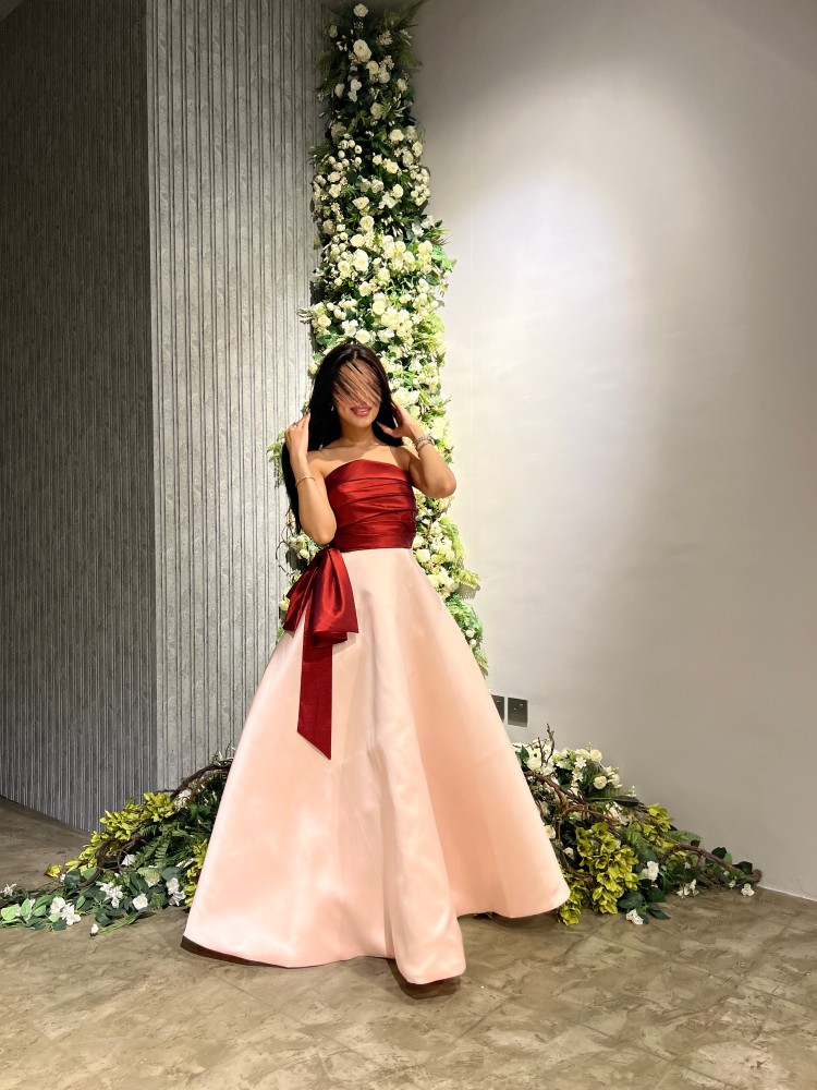 فستان عرايسي من لونين احمر و تفاحي مع ربطة على الخصر